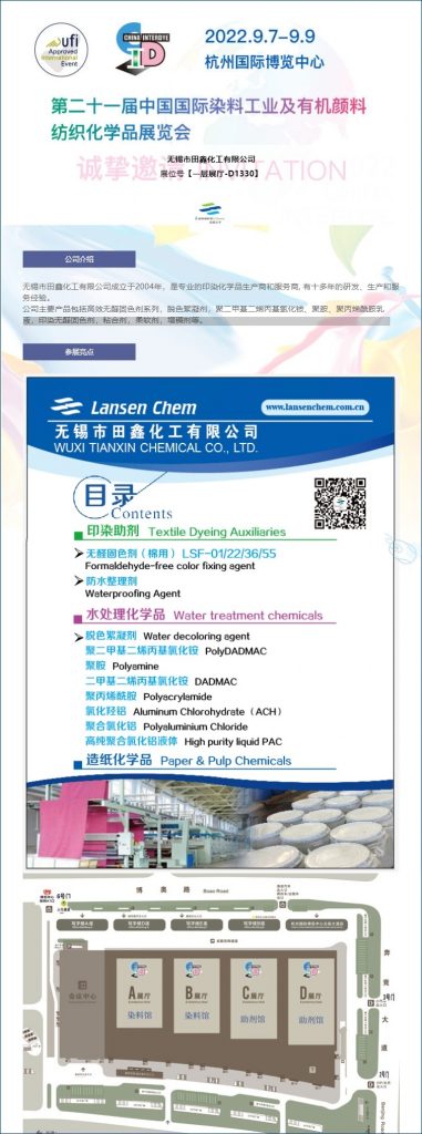 第二十一屆中國國際染料工業(yè)及有機顏料紡織化學(xué)品展覽會于2022.9.7-9.9在杭州國際博覽中心隆重舉行,無錫市田鑫化工有限公司誠摯邀請您蒞臨我司展位!