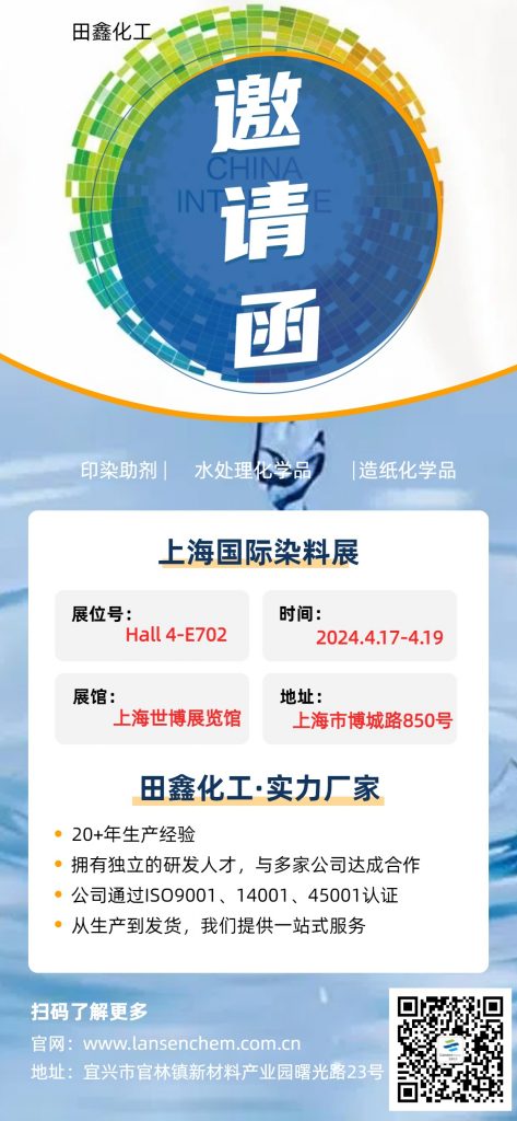 田鑫化工已報名參加第二十三屆上海國際染料紡織化學(xué)品展覽會!在這里誠摯邀請您參觀本次展會,田鑫化工展位號【4號館-E702】!