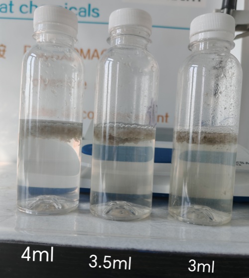 如圖比較:三個(gè)水樣的漆渣絮團(tuán)均已完美上浮,4ml的用藥量水質(zhì)最為清晰,3ml的水質(zhì)中有細(xì)小的漆渣在漂浮,3ml水質(zhì)清晰、水中無(wú)殘?jiān)峡蛻粢?,為最佳用藥量?/figcaption>