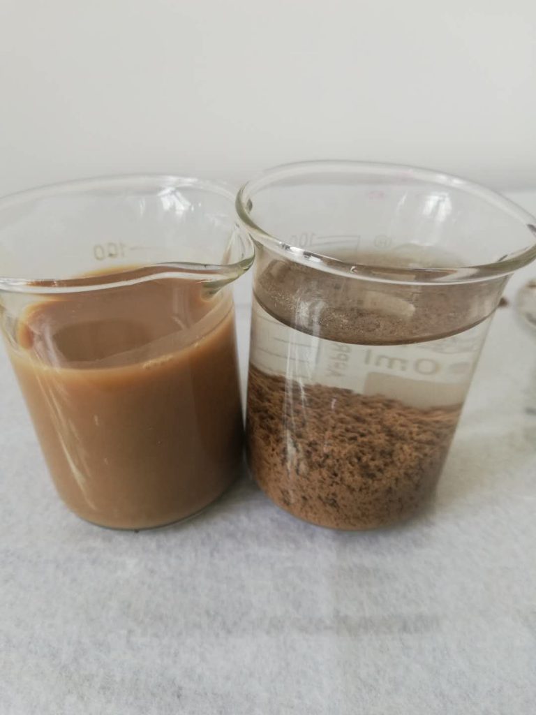 處理方案:在堿性條件下一噸水加聚二甲基100PPM ,陰離子聚丙烯酰胺5-10PPM,投加量遠(yuǎn)低于PAC,效果更明顯,沉降更快。