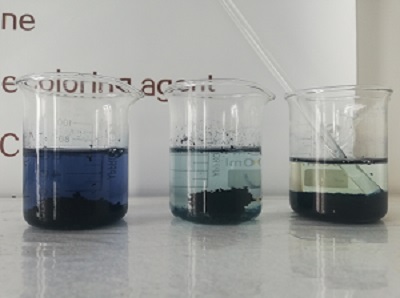 試驗過程:取原水50ML→依次加入一毫升脫色劑、PAC、PAM→攪拌→絮凝沉淀→靜置脫色